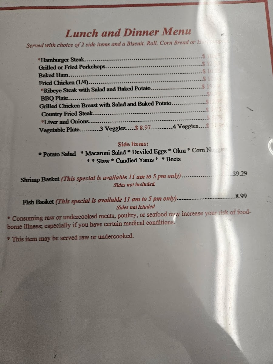 “ My wife and I have stopped here twice. Bo5h times the experience has been good. They have new owners who are working very hard to make improvements. The lady time we went, I ordered one of the daily specials, it took longer than expected to come out. The cook himself brought the food, apologized for the delay and explained, he didn't like the looks of what was left in the specials pans, so he made fresh. It was outstanding. We will be stopping here regularly. ”